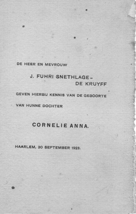 Cornelie Anna Fuhri Snethlage geboorte