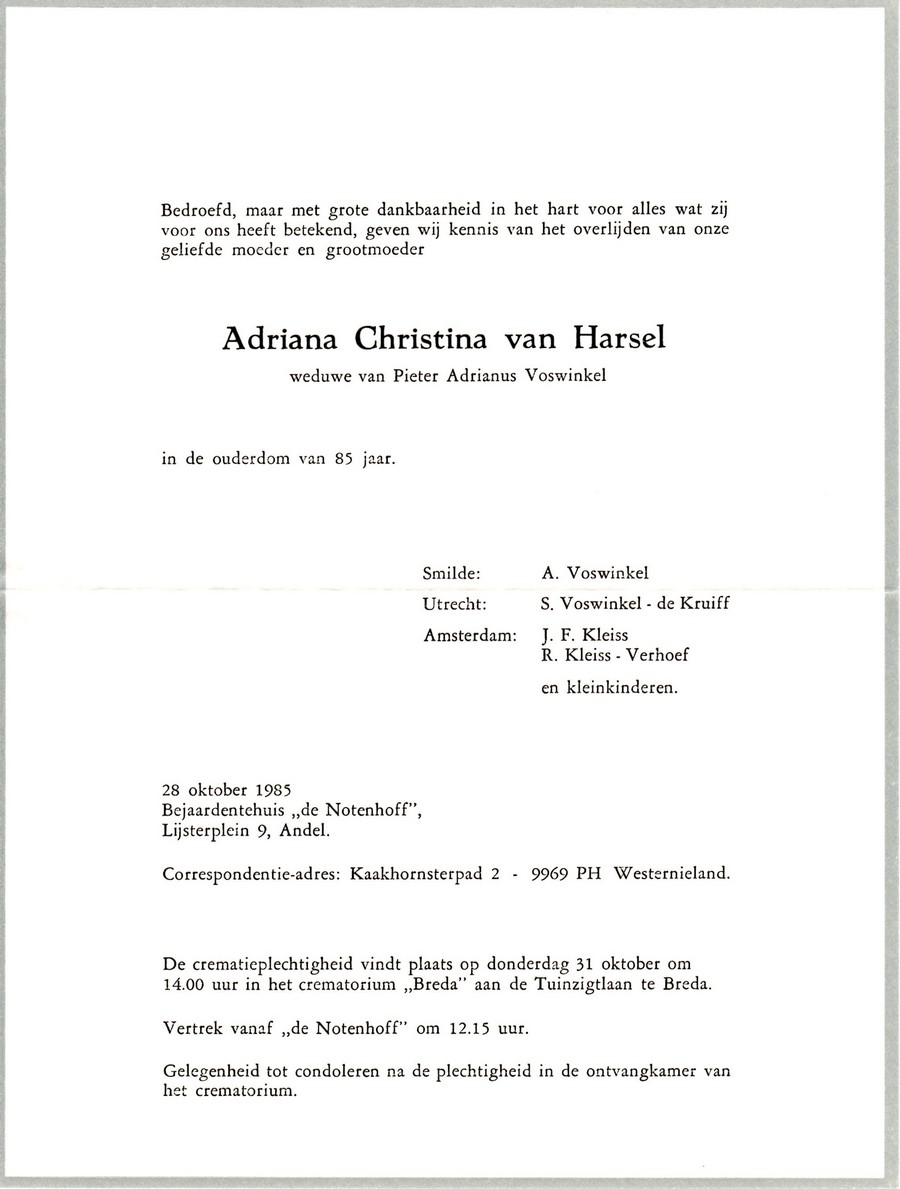 Adriana Christina van Harsel overlijden