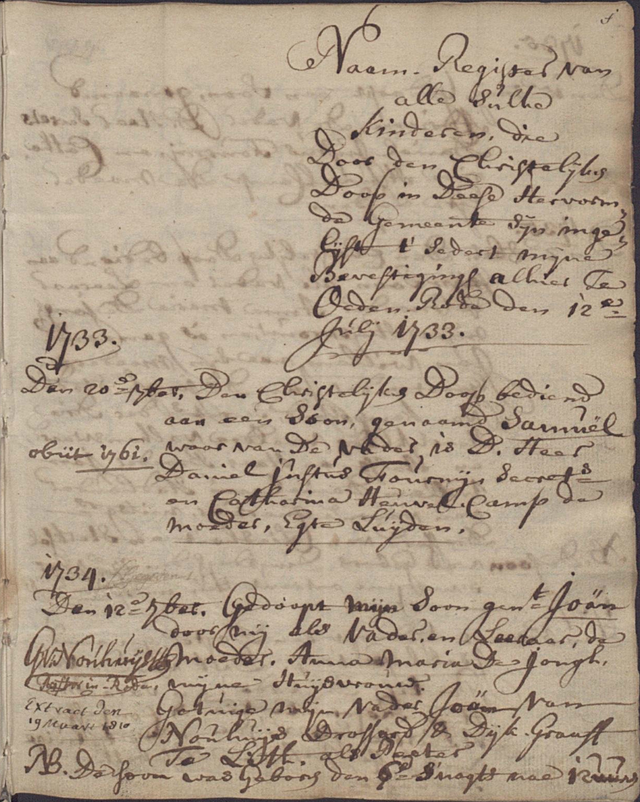 1734 Den 12e 7ber [september]. Gedoopt mijn soon genaamt Joan door mij als vader en leeraar, de moeder Anna Maria de Jongh mijne huijsvrouw. Getuige mijn vader Joan van Nouhuijs, drossard & dijk-graaff te Lith, als peeter NB. De soon was gebooren den 6e 's nagts nae 12 uuren |